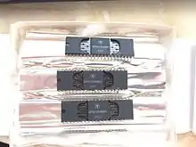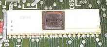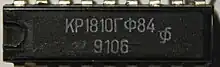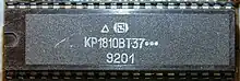 The K1810VM86 (Russian: К1810ВМ86)[1][2] is a Soviet 16-bit microprocessor, a clone of the Intel 8086 CPU with which it is binary and pin compatible. It was developed between 1982 and 1985.[3] The original K1810VM86 supported a clock frequency of up to 5 MHz while up to 8 MHz were allowed for the later K1810VM86M (К1810ВМ86M; corresponding to Intel 8086-2).[3] The K1810VM86 was manufactured plastic 40-pin dual in-line package (as KR1810VM86 / КР1810ВМ86) or in a 40-pin ceramic dual in-line package (as KM1810VM86 / КМ1810ВМ86 for the commercial version or M1810VM86 / М1810ВМ86 for the military version). A clone of the related Intel 8088 with its 8-bit bus was manufactured as the K1810VM88 (Russian: К1810ВМ88), also in plastic and ceramic packages.