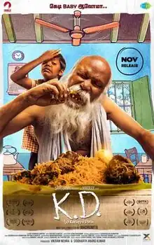 K.D. (also known as KD Engira Karuppudurai or simply Karuppudurai),[1][2] is a 2019 Indian Tamil-language comedy drama film written and directed by Madhumita and produced by Yoodlee Films, a production venture of Saregama India Limited. The film stars Mu Ramaswamy and Naga Vishal. The film has music composed by Karthikeya Murthy. Nagavishal won [3] Best Child Actor National Award in 2021 and Best Actor Award at the Jagran Film Festival 2019.[4] Madhumita was awarded the Best Director at the UK Asian Film Festival 2019.[5] K.D. released worldwide on 22 November 2019.[6]