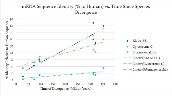 A graph shown below of the molecular evolution of RESF1 shows that it evolved relatively quickly compared to both cytochrome C, a slowly evolving protein, and fibrinogen alpha, which evolved more quickly than cytochrome C. The comparison shows that RESF1 is fairly quickly diverging, which suggests that it could be a gene that changes quickly in response to its environment, such as the introduction of a pathogen.
