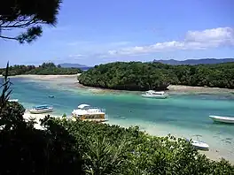 Kabira Bay (川平湾, Kabira wan) is located on the north coast of Ishigaki Island, Okinawa Prefecture, Japan. Renowned for its white sands, turquoise waters and dense vegetation, the bay forms part of the Iriomote-Ishigaki National Park.[1] Alongside Mount Omoto, it has been designated a Place of Scenic Beauty.[2] Black pearls are cultured in the bay.[3]