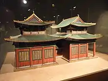 The earliest stele erected by the Kaifeng community bears the date 1489. This, it is affirmed, commemorates the construction in 1163 of a synagogue called Qingzhensi (清真寺: qīngzhēnsì, "True and pure Temple"),[26] the customary term for mosques in China.[lower-alpha 11] The inscription states that the Jews came to China from Tiānzhú (天竺),[lower-alpha 12] a Han-Song term for India. It adds that they brought Western cloth as tribute for an emperor, unnamed, who welcomed them with the words: "You have come to Our China; reverence and preserve the customs of your ancestors, and hand them down at Bianliang (汴梁: Biànliáng)," i.e., Kaifeng.[21] The same stone inscription also associates the building's establishment with two names: An-du-la (俺都喇: Ăndūlǎ perhaps Abdullah)[27][lower-alpha 13] and a certain Lieh-wei (列微: Liè wēi),[lower-alpha 14] probably transcribing Levi, who is described as the Wu-ssu-ta (五思達: Wǔsīdá) of the community. This last term probably is a phonetic rendering of the Persian word ustad, ("master", religious leader),[28][27][29][30] and "rabbi" in a Jewish context in that language.[31][32]
