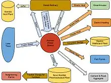 The Kalundborg Eco-Industrial Park is the first full realization of industrial symbiosis.[1] The collaboration and its environmental implications arose unintentionally through private initiatives, as opposed to government planning, making it a model for private planning of eco-industrial parks.[2] At the center of the exchange network is the Asnæs Power Station, a 1500MW coal-fired power plant, which has material and energy links with the community and several other companies. Surplus heat from this power plant is used to heat 3500 local homes in addition to a nearby fish farm, whose sludge is then sold as a fertilizer. Steam from the power plant is sold to Novo Nordisk, a pharmaceutical and enzyme manufacturer, in addition to Statoil oil refinery. This reuse of heat reduces the amount thermal pollution discharged to a nearby fjord. Additionally, a by-product from the power plant's sulfur dioxide scrubber contains gypsum, which is sold to a wallboard manufacturer. Almost all of the manufacturer's gypsum needs are met this way, which reduces the amount of open-pit mining needed. Furthermore, fly ash and clinker from the power plant is used for road building and cement production.[3] These exchanges of waste, water and materials have greatly increased environmental and economic efficiency, as well as created other less tangible benefits for these actors, including sharing of personnel, equipment, and information.[1]