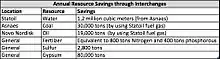 All of these exchanges have contributed to water savings, and savings in fuel and input chemicals. Wastes were also avoided through these interchanges. For example, in 1997, Asnaes (the power station) saved 30,000 tons of coal (~2% of throughput) by using Statoil (large oil refinery) fuel gas. And 200,000 tons of fly ash and clinker were avoided from Asnaes landfill.[3] These resources savings and waste avoidances, documented before 1997, are illustrated in the tables to the right.