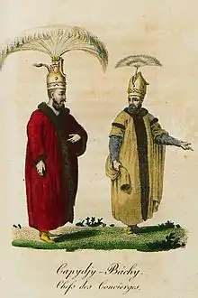 The Ottoman title of kapıcıbaşı designated the chief of the palace gatekeepers, or "chief warder".[1] In the early phase of Ottoman statehood there was one single title-holder. It multiplied over time and there were in the 18th century some 150 simultaneous title-holders.[2] The holder supervised the palace gatekeepers (kapıcılar), was in charge of guarding the gates, transmitted messages and orders, and executed Imperial Council orders.[1]