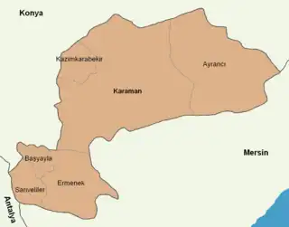 Karaman Province (Turkish: Karaman ili) is a province of south-central Turkey. Its area is 8,678 km2,[2] and its population is 260,838 (2022).[1] According to the 2000 census, the population was 243,210. The population density is 30 people/km2. The traffic code is 70. The capital is the city of Karaman. Karaman was the location of the Karamanid Beylik, which came to an end in 1486.