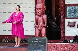 A woman performs a karanga during a pōwhiri at Te Whare Rūnanga on the Waitangi upper treaty grounds in January 2022