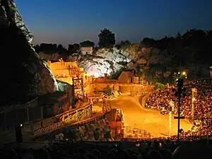 The 'Karl May Festival' (German: Karl-May-Spiele Bad Segeberg,') is a theatre festival in Bad Segeberg, Schleswig-Holstein, Germany. Since 1952, Karl May's adventure novels about the Wild West have been put on stage as part of Karl May Festival in the Kalkberg Stadium at the scenic Segeberger Kalkberg.