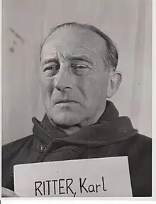 At the war's end Ritter was arrested. At the Ministries Trial in 1947, he was arraigned on five counts. He was found innocent on the first, promotion of aggressive war. On the third count, crimes against humanity, specifically Jews, Catholics and other minorities, the judgement of the court was that Ritter was implicated in the deportation of Jews from Denmark, France, and Hungary, but that while he was under no illusions concerning the fate of Jews deported to the East, he "most likely had no immediate knowledge of the extent, methods, and associated circumstances of the measures to exterminate the Jews" and that "knowledge of the commission or existence of a crime suffices for a conviction only in those cases where a legal obligation exists to prevent or oppose an action."[9] On the remaining counts he was found Not Guilty in the sense of the indictment, except for the second count, war crimes, specifically killing and mistreating participants in the war and prisoners of war, on which he was found guilty in two instances, firstly of Foreign Office complicity in an order not to prosecute cases of lynching of Allied flyers, regarding which the judgement of the court was that while Ritter was not the originator of this policy of murder, he was guilty of carrying it out;[10] and secondly of the killing of escaped prisoners of war, because in his function within the Foreign Office he was obligated to inform the OKW that under the Geneva Convention of 1929 and Article 14 of the Hague Convention of 1907, the Swiss Embassy extends its protection to British prisoners of war, and he had instead been complicit in the sending of an untrue and misleading memorandum to the Swiss Embassy. One of the three judges, Leon W. Powers, dissented on both counts.[11]