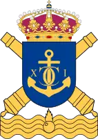 The coat of arms of the Karlskrona Coastal Artillery Regiment (KA 2) was established in 1967.[6] Blazon: "Azure, The monogram of King Charles XI surmounted an erect anchor. The shield surmounted two gunbarrels of older pattern in saltire above a flaming grenade and waves, all or."[7]