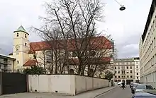 On the west side of the Karmeliterstraße is the former Karmeliten Church of Saint Nicholas, built from 1657 to 1660.[1] Today, the profaned building is used as an archive of the Archdiocese of Munich and Freising, while a section serves as an event and exhibition area. Adjacent to it are buildings of the Ordinary of the Archdiocese of Munich with a park, which is separated by a wall from the Karmeliterstraße.