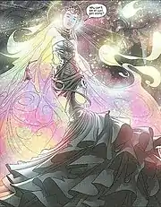 Like all Majesdanians, Karolina's natural form is luminous, iridescent, and visually fluid, often depicted with waves of rainbow-like light floating off her body (Chase described her as "a burning painting") though body structure is essentially humanoid.[15] Originally, Karolina required a custom made medic alert bracelet constructed of an unspecified alien metal to revert to humanoid form. However, after spending many months on Majesdane, Karolina learned to control the change and can make it at will.[25] In her Majesdanian form, Karolina is able to manipulate solar energy absorbed by her body to generate large concussive blasts, fine laser-like beams and force fields capable of stopping cave-ins, gunfire and explosions.[50][51][11] Like her parents, Karolina learned the ability to bind people, binding a New Pride in a colorful sphere. Karolina's Majesdanian form also grants her the ability to fly.[52] During an encounter with the vampire Topher, it is revealed that Karolina's blood also harbors solar energy-based properties, because drinking her blood caused Topher to combust.