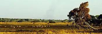 Dambos are grassy drainage channels and basins with little to no woody vegetation but very palatable grasses. Most woody species grow on exposed termitaria as dambos tend to retain water very well. Dambos are of a vital importance to grazing mammal species as well as several woodland mammals that choose to graze on the fringes, especially during the dry season. Several large (several square km) grassy plains occur within the park such as Chinyangali close to Fibwe and the Chikufwe plain east of the Luwombwa River.[1]