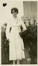 Katharine Jane Densford (1890–1978) was born in Crothersville, Indiana in 1890.[2] In her late teens, she was hired by a family friend to teach fourth, fifth and sixth grades at a girls’ “industrial school” which was a boarding school for girls as young as eight years old, who were termed ‘delinquents’, located in Indiana. Besides teaching the full curriculum for those grades, she also instructed in ‘manual training. She earned her B.A. degree, magna cum laude, at Miami University, Oxford, Ohio and then earned her M.A. in history at the University of Chicago, Chicago. She returned then to teaching, first Latin and German at a high school in Harbor Springs, Michigan, and then History for several years in a Bismarck, North Dakota high school.[3][4][5]:97 The outbreak of World War I caused her to evaluate how to best serve her country, and she decided to become a nurse. [note 1][7]:88–89 [4]