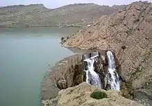 The Kebar Dam is a masonry arch dam on the Kebar River, Iran, located near a town of the same name,[1] 23 km southeast of Qom, near the village of Zanburak in Jannatabad, Qom. The dam is an early arch dam and was the first arch dam constructed by the Mongolians, around 1300 AD.[2] It is the oldest surviving arch dam.[3] The dam is 26m tall and 55m wide and was constructed for irrigation water supply. It was originally 24m tall but 2m of height was added in either the beginning or middle of the 17th century. The arch of the dam was of normal curvature with a radius of 35m and angle of 45-degrees. While the dam sat on limestone, its curve rested on two winged walls that served as abutments.[1] The downstream face of the dam was vertical until near its abutment where it slightly curves out. Near the dam's right, or western, abutment there is a 10m deep cylindrical hole which served as an intake and outlet works for the dam.[4] The outlet works is located at the bottom and is a larger opening but there are various smaller openings throughout the shaft to release water. The dam impounded a small reservoir that is no longer used and is mostly filled with silt.[5][6][7][8][9]