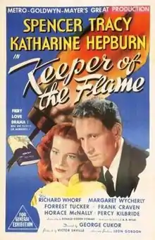 Keeper of the Flame is a 1942 American drama film directed by George Cukor, and starring Spencer Tracy and Katharine Hepburn, released by Metro-Goldwyn-Mayer (MGM). The screenplay by Donald Ogden Stewart is adapted from the 1942 novel Keeper of the Flame by I. A. R. Wylie. Hepburn plays the widow of a famous civic leader who has died in an accident. Tracy portrays a former war correspondent who intends to write a flattering biography of the dead man, only to find that his death is shrouded in mystery. Screenwriter Stewart considered the script the finest moment of his career, feeling vindicated by the assignment as he believed that Hollywood had punished him for years for his political views. Principal filming began in the last week of August 1942, four months after the release of the novel, published by Random House. The picture was filmed on a sound stage, with no location shooting. Hepburn had already begun a relationship with Tracy, and his heavy drinking led her to become his vigilant guardian during the filming.
