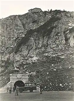 A 4 m (13 ft) wide approach road climbs 800 m (2,600 ft) over 6.5 km (4.0 mi); it includes five tunnels and one hairpin turn. It cost 30 million ℛ︁ℳ︁ to build (about $247 million USD, inflation-adjusted for 2022). Hitler's birthday in April 1939 was considered a deadline for the project's completion, so work continued throughout the winter of 1938, even at night with the worksite lit by searchlights.[4]