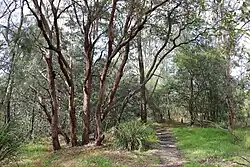 Kelly's Bush covers 4.8 hectares (12 acres) of bushland on the lower reaches of the Parramatta River in the Sydney Metropolitan Area. It is part of a network of near natural open spaces on the Sydney Harbour waterway system and is the only substantial area of natural bush on the lower Parramatta River. Kelly's Bush is the largest area of near natural bush on the Hunter's Hill peninsula. It is linked directly to Weil Park to the north, Nelson Parade and residential areas to the west, the Parramatta River to the south and residential areas and Woolwich Marina to the east. Kelly's Bush lies on the southerly aspect of the major ridge line of the Hunter's Hill Peninsula, which runs in an east-west direction. There are five major vegetation communities found in Kelly's Bush: eucalyptus (dominant), heath/closed shrub, closed rainforest, banksia/low closed forest and closed scrub/weed areas.[1] The moss Racopilum cuspidigerum is known to occur here.[8]