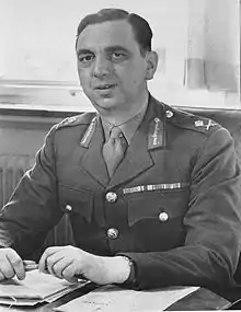 In August 1945, Strong became deputy director of the Political Warfare Executive, succeeding Sir Bruce Lockhart as its head a month later. With the elevation of Montgomery to Chief of the Imperial General Staff in 1946, the career prospects of officers who had served at SHAEF, like Morgan, Gale, Whiteley and Strong, became dim,[28] and Strong retired from the Army with the rank of major general on 9 May 1947 to become a civil servant.[29]