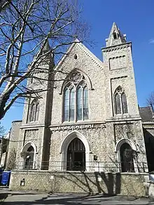 The present church building was founded as Horbury Chapel, and used by the Hornton Street Congregational church, Notting Hill, in 1849.[1] The building was purchased in 1930 by George Jeffreys.[2] This became the Bible-Pattern Church Fellowship, Elim's flagship church, becoming Kensington Temple, Church of the Foursquare Gospel in 1935.[3]