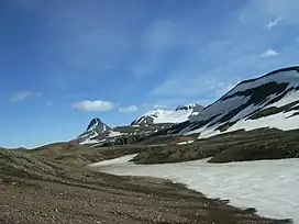 Kerlingarfjöll (Icelandic pronunciation: [ˈcʰɛ(r)tliŋkarˌfjœtl̥] ⓘ) is a 1,477 m (4,846 ft) tall mountain range in Iceland situated in the Highlands of Iceland near the Kjölur highland road. They are part of a large tuya volcano system of 100 km2 (39 sq mi). The volcanic origin of these mountains is evidenced by the numerous hot springs and rivulets in the area, as well as red volcanic rhyolite stone of which the mountains are composed. Minerals that have emerged from the hot springs also color the ground yellow, red and green.