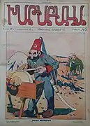 The main purpose of the magazine was to satirically depict various social phenomena, such as inequality, cultural assimilation and corruption, and to ridicule backward lifestyles and values of the clergy and bureaucrats. Khatabala harshly condemned the anti-Armenian policy of the Ottoman Empire and championed the friendship of the peoples of Transcaucasia. It contained frequent responses to international events, and traced the liberation struggle of the peoples of the Balkans and the East.[1] Its repeated solidarity with Azerbaijani satirical magazine Molla Nasraddin gained widespread attention.[6][10][11] It is a visually stunning and extremely rich source on the life of Armenians in early twentieth-century Tiflis, Constantinople, and beyond, and an important response to the repressive anti-Armenian policies of the Ottoman Empire and, in later years, the Armenian genocide.[12] During the First World War, it was published in the Armenian and Russian languages and was closed in 1916.