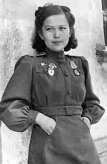 Khiuaz Qayrqyzy Dospanova (Russian: Хиуаз Каировна Доспанова, romanized Khiuaz Kairovna Dospanova, Kazakh: Хиуаз Қайырқызы Доспанова; 15 May 1922 – 20 May 2008) was a Kazakh pilot and navigator who served during World War II in the 588th Night Bomber Regiment, nicknamed the "Night Witches." In addition to being the first Kazakh woman officer in the Soviet Air Force,[1] she was the only Kazakh woman to serve in the "Night Witches". Despite sustaining multiple fractures in her legs in a ground collision in 1943, she returned to active duty and continued to participate in sorties against doctor's recommendations; she was eventually awarded the title Hero of Kazakhstan in 2004 for her perseverance, and Atyrau International Airport is named in her honor.