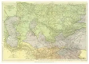 By 1868, the Russian conquest of Turkestan had captured Tashkent and Samarkand, and gained control over the khanates of Kokand in the eastern mountains and Bukhara along the Oxus River. This left a roughly triangular area east of the Caspian, south of the Aral Sea and north of the Persian border. The Khanate of Khiva was at the north end of this triangle.