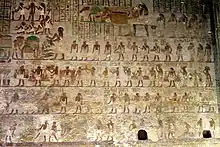 On the west wall of the chamber are scenes showing mainly the preparations for the funeral and the resurrection of the deceased.[2]: 81 This is exemplified by the boat voyages making a connection between Khnumhotep II and the god Osiris. The orientation of the boats within the tomb literally has them travel south to Abydos (right of the entrance) and north to return (left of the entrance).[6] The wall collectively ensures the tomb owner of rebirth in the afterlife where he will be sustained through cult activities.