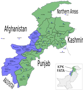 North-West Frontier Province including the princely states of Chitral, Swat and Dir (in green) and Frontier Tribal agencies (in blue)