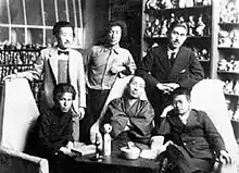 In 1906, he was apprenticed to Seiki Kuroda to study yōga at the age of 18.[1] Among his fellow pupils was Ryūsei Kishida, with whom Okamoto formed an artists' group and named it Fusain Society (Fyūzankai) to promote post-impressionism.[3] Enthralled by Vincent van Gogh and Paul Cézanne, they held an exhibition challenging the conservative Bunten in 1912.[1][3][4] It angered Kuroda and brought an end to their mentoring relationship, leading to the split of Fusain Society.[1][5] Nevertheless, Okamoto and Kishida organized a new group together with Shōhachi Kimura and Kōtarō Takamura to give an exhibition of their own paintings in October 1913.[6]