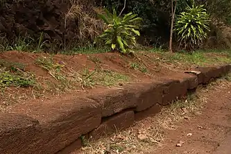 Hawaiians built many stone-lined ʻauwai to irrigate ponds for growing taro (kalo), but very rarely employed dressed stone to line ditches. The 120 finely cut basalt blocks that line about 200 feet of the outer wall of the Menehune Ditch make it not just exceptional, but "the acme of stone-faced ditches" in the words of archaeologist Wendell C. Bennett.[3]