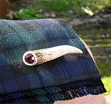 Some people think that a kilt pin could damage a kilt. As the 1914 President of the Scottish Society, Loudon MacQueen Douglas pointed out, a "claw brooch" (a popular style, usually made from a grouse foot) is easily caught on a lady's dress while dancing, potentially damaging both the dress and the kilts.[6] A precaution can be taken in applying buttonhole stitching around the hole where the kilt pin goes into the cloth. This strengthens the cloth so that tearing is less likely.[4] Placing a piece of leather behind the front apron and attaching the kilt pin through the cloth and the leather could also reduce the likelihood of tearing.