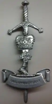 The custom of wearing a pin came in during Queen Victoria's reign to stop the kilt apron flapping about too much and showing more of the wearer's anatomy than the Queen liked.[3] The story goes that the Queen gave her own brooch to a soldier who was struggling with his kilt in windy conditions. Author J. Charles Thompson writes that Queen Victoria brought in rules stating that all military kilts must have a fastening, and although the soldiers then wore kilt pins, they didn't fasten the layers of cloth with them as that would change the way the kilt hung.[4]