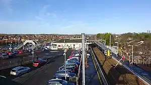 The station is located on Byers Road about 1⁄2 mile (800 m) from the town centre. There is a staffed ticket office (open Monday - Saturday 06:05 - 23:30 Sunday 08:50- 23:30), a toilet, a kiosk, a waiting room and a ticket vending machine. Train running information is offered via digital CIS displays, automated announcements, timetable posters and customer help points on each platform. In 2012, a new 130-space car park opened. In 2019 the station went under accessibility upgrades to add lifts to a new crossbridge and step-free access to all platforms.[4]