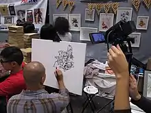 Kim primarily drew in ink, and used a variety of pens from different manufacturers, including fineliners, brush pens, and simple ballpoint pens.[4][16] When asked, he claimed that his skill came from his habit of constantly drawing, rather than his choice of pen; he also denied claims that he was an autistic savant.[4] Kim was sponsored by Pentel.[16]