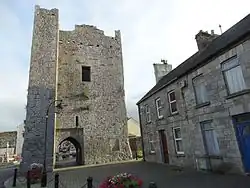 A four-storey tower house with some original mullioned windows. It is vaulted above the ground floor and the front and back walls were removed so that the castle is pierced by a large Gothic arch.[10]