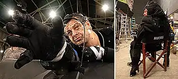 Jackson saw King Kong as opportunity for technical innovations in motion capture, commissioning Christian Rivers of Weta Digital to supervise all aspects of Kong's performance.[30] Jackson decided early on that he did not want Kong to behave like a human, and so he and his team studied hours of gorilla footage.[31] Serkis was cast in the title role in April 2003[9] and prepared himself by working with gorillas at the London Zoo. He then traveled to Rwanda, observing the actions and behaviors of gorillas in the wild.[10] Rivers explained that the detailed facial performance capture with Serkis was accomplished because of the similarities between human and gorilla faces. "Gorillas have such a similar looking set of eyes and brows, you can look at those expressions and transpose your own interpretation onto them."[30] Photos of silverback gorillas were also superimposed on Kong's image in the early stages of animation.[32] Serkis had to go through two hours of motion capture makeup every day, having 135 small markers attached to different spots on his face.[30] Following principal photography, Serkis had to spend an additional two months on a motion capture stage, miming Kong's movements for the film's digital animators.[33]