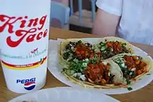 King Taco is a fast food restaurant chain headquartered in Los Angeles, California, which offers a variety of Mexican-inspired dishes, including soft tacos, burritos, sopes, tamales, nachos, and rotisserie chicken.[1] Additionally, they serve traditional Mexican drinks such as horchata and jamaica. The chain was founded in 1974 by Raul Martinez, and since then, it has expanded to over 20 locations throughout Southern California.