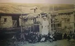 In its early years it was joined by local Jewish farmers from the surrounding villages, and very soon after by the very young pioneers of the Second Aliyah.[8] The original Jewish settlers stayed in the so-called Khan, a word meaning caravansary, and being no more than a storage building bought from a local Bedouin tribe.[8] The early days were marked by poverty, malaria, Bedouin attacks and ideological conflict. After a workers' strike in October 1909, Ruppin allowed the workers on the farm to split in two: the farm went on being run by a rather authoritarian agronomist, while seven pioneers were given autonomy and founded the first kvutza. They were a young group who received from the national Zionist organisations a plot of land to toil, which they managed to do more successfully than the hierarchically run Kinneret farm. They eventually settled down, naming their commune Degania.[6] This group was part of an influential, if small wave of young Zionists who derived inspiration from Ber Borochov's Marxist-socialist ideas as much as from the mystical "religion of labour" of A.D. Gordon, a man morally influenced by ideas he had brought with him from his native Russia, the agrarianism of the Narodniks and Tolstoy's spirituality.[9]