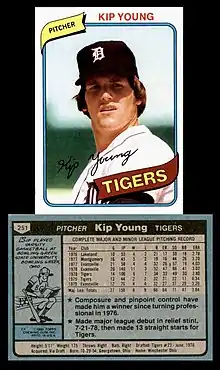 Kip Lane Young (born October 29, 1954) is a former baseball player. A right-handed pitcher, Young played Major League Baseball with the Detroit Tigers in 1978 and 1979. As a rookie in 1978, he pitched complete-game victories in his first four starts and compiled a 2.81 earned run average (ERA) for the season.