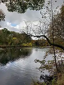 The nature reserve is shaped by Kirklees Brook, a minor river which feeds into the River Irwell. According to the Environment Agency (a body supported by the UK Department for Environment, Food & Rural Affairs[5]), the river contains good quantities of invertebrates, but poor quantities of fish, along with high concentrations of dissolved ammonia and oxygen. Like all rivers in the UK,[6] Kirklees Brook has a chemical status of Fail, mostly due to Mercury and Polybrominated diphenyl ethers.[7]