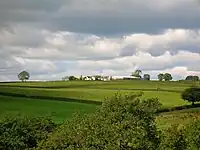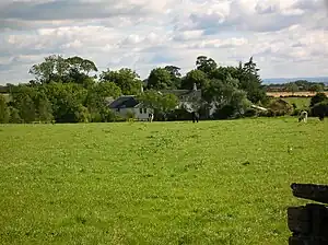In 1779 a mansion still stood at Kirkwood near the middle of a small enclosure, with an apparently raised area in front, delineated by trees.[14] The mansion house stood until the 1790s.[16] The first 6-inch OS map shows a well laid out garden complex in front of Kirkwood, corresponding to the raised area shown on the 1779 map, with paths that led, following field boundaries, to the old toll road near North Kilbride Farm.[17] In 1799 a 'smiddy park' is shown with three buildings to the west of the house. Gunshill nearby is shown as a single building with a small enclosure in front of it.[14] The field or 'Park' names of Kirkwood and Gunshill are of interest, including Whin, Johnshill, Stone, Byrestead, Gooseward, Ward, Wood, Long Crooks, Hillock Holm and the Chapel-lands across the road.[14]