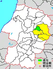 Murayama County was an ancient place name in part of Dewa Province, occupying the area of modern Mogami, Nishimurayama, Higashimurayama and Kitamurayama districts. Under the Tokugawa shogunate, the area Kitamurayama district was a complicated mosaic. Two towns and 48 villages were tenryo ruled directly by the Tokugawa shogunate, 32 villages were part of Matsumae Domain in Ezo, 13 villages were part of Shinjō Domain, 7 villages were under Tsuchiura Domain, 4 villages were under Nagatoro Domain, 2 villages were part of Tendō Domain, 2 villages were part of Tatebayashi Domain and 1 village was part of Sakura Domain The area became part of Yamagata Prefecture in 1876. At that time, Kitamurayama District consisted of 2 towns and 105 villages.