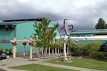 The school was named for the Chinook Jargon word "klahowya", which means "welcome".[3] It was planned in the 1990s and opened in 1997. Originally scheduled to open in 1996, it was delayed for another year.[4] Serving grades 6-12 (after 2016), it was the third high school in Central Kitsap School District. The first senior class graduated in 1999.[5] In 2016, the school expanded to include sixth graders. Two years later, a new wing, auxilary gymnasium, 13 classrooms, three laboratories, a fitness room and a second music room were opened as part of a 45,300 square feet (4,210 m2) addition. A new track and field stadium was also added.[6] On March 13, 2020, Klahowya remained closed due to the COVID-19 pandemic.[7]
