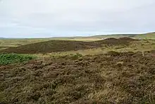 The Knowes of Trotty Bronze Age burial site is located east of the Loch of Harray, in Mainland, Orkney. Twelve burial mounds are situated at the bottom of the western slopes of the Ward of Redland. The mounds are laid out in two rows, and range in diameter from 9 to 18 m (30 to 59 ft), and in height from 0.6 to 3 m (2.0 to 9.8 ft) in height.[1] The largest mound, is at the north end of the group and is 18 m (59 ft) in diameter, 3 m (9.8 ft) in height, and sits on an elevated platform. The barrows were originally surrounded by a stone cairn which was then covered in earth.[2]