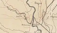 The Decau­ville railway with a gauge of 600 mm (1 ft 11+58 in) started from the railway station Axioupolis (Αξιούπολης). The station was known until 1927 as Goumentja. The railway crossed the town of Axioupolis, historically known as Bohemitsa (Μποέμιτσα) passing two churches and a mosque. To gain height quickly, it went through an elaborately built Vróncho Spiral (βρόγχο), to Pigi (Πηγή), then known as Isvor. From there it followed the valley of the Kodza Déré River to the terminus Black Tree (μαύρο δένδρο) below the Koúpa Mountain (Κούπα), to supply the Allied Forces at the Macedonian front with supplies and ammunition.