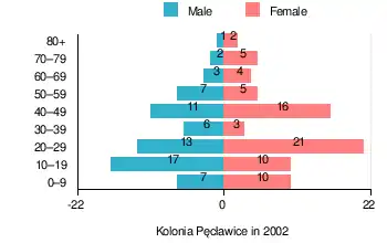 According to the 2002 Poland census, there were 143 people residing in Kolonia Pęcławice village, of whom 46.9% were male and 53.1% were female. In the village, the population was spread out, with 26.6% under the age of 18, 41.3% from 18 to 44, 21.7% from 45 to 64, and 10.5% who were 65 years of age or older.[1]