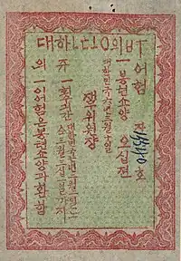 The Korean Unification Government (Korean: 대한통의부), previously known as the Unification Military Government, was an independence movement group organized in Manchuria in February 1922 by integrating several independence movement groups active in the West Jiandao region. The Unification Government expanded and reorganized into the Korean Unification Government in August 1922, which was established as the first integrated independence army organization in West Jiandao and revitalized the activities of the independence army, which had been in a temporary stagnation, under the banner of Daedong unity.[1] They carry out the anti-Japanese independence movement more effectively at the South Manchurian Unification Association held in Magwonja, Nam-gu, Hwanin-hyeon, Bongcheon-province. The Korean Unification Government carried out autonomous activities such as education and industry promotion and various armed struggle activities in the West Jiandao region. Due to its nature as a union of various organizations with different backgrounds, a division occurred, and it was divided into the reformed Righteous Army Command, General Staff Headquarters, and Righteous Government.[2][1]