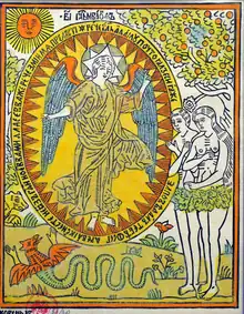 The most distinctive interpretive rendering in the Koren Bible is the Adam and Eve story: that it was the violence of Cain against Abel—and not the disobedience to God of Adam and Eve—that was the downfall of humanity. Adam and Eve are shown at their creation with halos, losing them only temporarily when they sin and are expelled from Eden, but regaining them when they repent. They are shown living, hallowed, into old age. Thus the moral responsibility for bringing evil into the world is displaced to Cain, who envied, hated and killed his brother Abel, and lied to God. It makes the taking of life the highest crime. This does not fit with the moral stance of the Old Believers, whose leader, Protopop Avvakum, emphasized that, while the rest of creation is called into being "by the word" of God, Adam and Eve are made of clay. Their disobedience—eating from a forbidden fig tree and their resultant intoxication—leads to a sin of the flesh. The Koren Bible emphasizes that light rules both day (sun) and night (stars). And though the devil makes his bid for power, God casts him down into the abyss (Hell), which is represented by a cutaway space at the bottom corner of the picture, indicating a place beneath the surface of the earth.