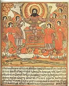 The Koren Bible has as its immediate prototype that of the Kievan, Iereia Prokopii's, apocalyptic woodcut series (1646–1662).[3] Prokopii's Apocalypse in turn follows the Luther-Piscator iconography, and the Piscator Bible draws on the original Albrecht Dürer iconography. The connection to Prokopii is evident, not just deduced from the close correspondence of the iconography in most of the pictures, but from the fact that each of Kineshemtsev's pictures bears the number of the corresponding print in the Prokopii Apocalypse. In one instance, where Kineshemtsev combined elements from two pictures of Prokopii's series, that print bears both numbers.[4] Although Kineshemtsev more or less follows Prokopii's iconography in all his drawings, his artistry is unique and far superior to Prokopii's. Prokopii can be said to have done half the work of adapting Dürer to the Old Russian style, while Kineshemtsev made of them "freski-lubki." For example, the figures become more icon-like and certain folk design elements are introduced, a grainfield is substituted for a cityscape, and the prophets Enoch and Elijah are introduced, .